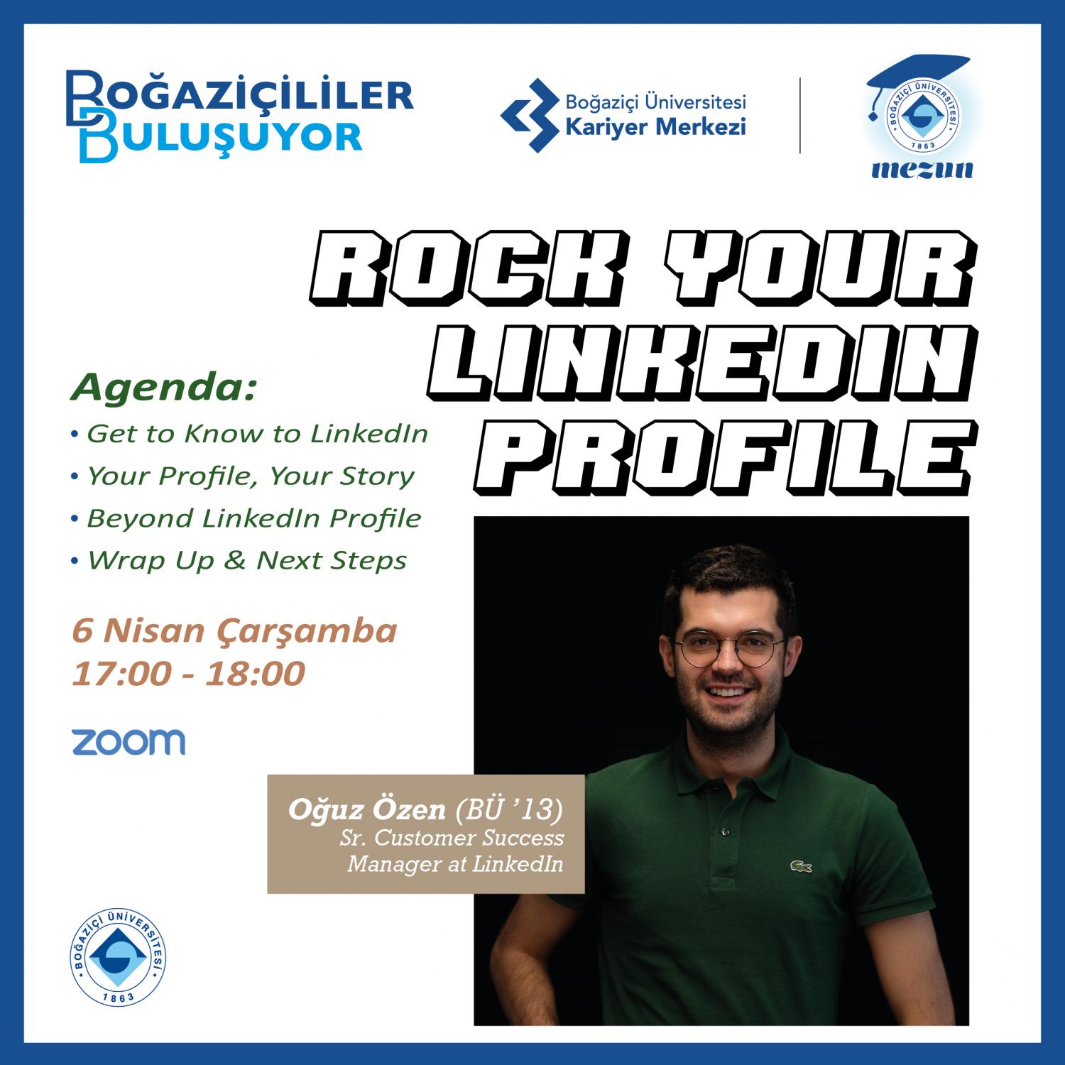 Boğaziçi Üniversitesi Kariyer Merkezi ve Mezunlar Ofisi iş birliği ile mezun ve öğrencilerimizi bir araya getiren seminer serisi Boğaziçililer Buluşuyor başlıyor! Mezunlarımızın kişisel ve profesyonel deneyimlerini paylaşarak kariyer yolculuklarımızda yol gösterici bilgiler sunacağı buluşmalara mezunumuz Oğuz Özen (BU'13) ile başlıyoruz. 6 Nisan 2022 Çarşamba günü saat 17.00'da "Rock Your Linkedin Profile" başlıklı sunum ile Zoom platformunda buluşuyoruz.