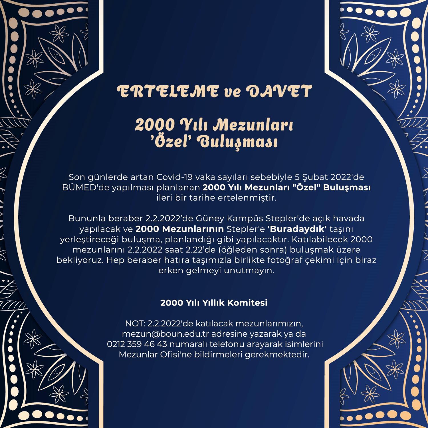 Pandemi koşulları sebebiyle 5 Şubat 2022'de gerçekleşecek olan 2000 mezunları buluşması ileri bir tarihe ertelenmiştir.